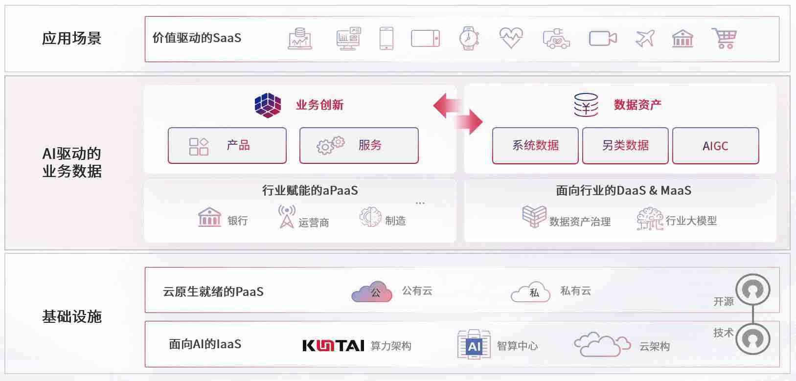 在基础设施层面,,,,基于商业或开源的云原生就绪开发工具与技术组件(PaaS)和面向AI的底层公共基础设施资源(IaaS),,,将共同支撑企业完成数字化转型